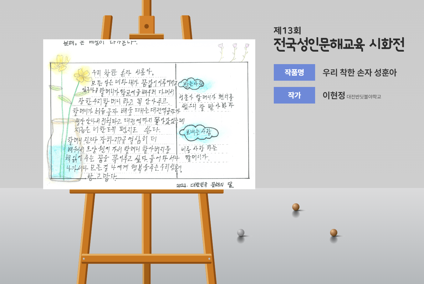 전국성인문해 시화전에서 엽서부문 글꽃상을 받았어요.