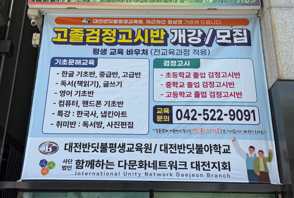 1년이 넘어서 낡아보이던 출입구 옆 현수막을 새 현수막으로 멋지게 교체했습니다. 많은 관심과 외국인 한국어 교육, 성인문해교육, 검정고시반, 평생교육사 실습, 성인문해교육사 자격증반 등 다양한 운영을 하고 있는 대전반딧불평생교육원, 관심과 사랑 바래요~~~^^